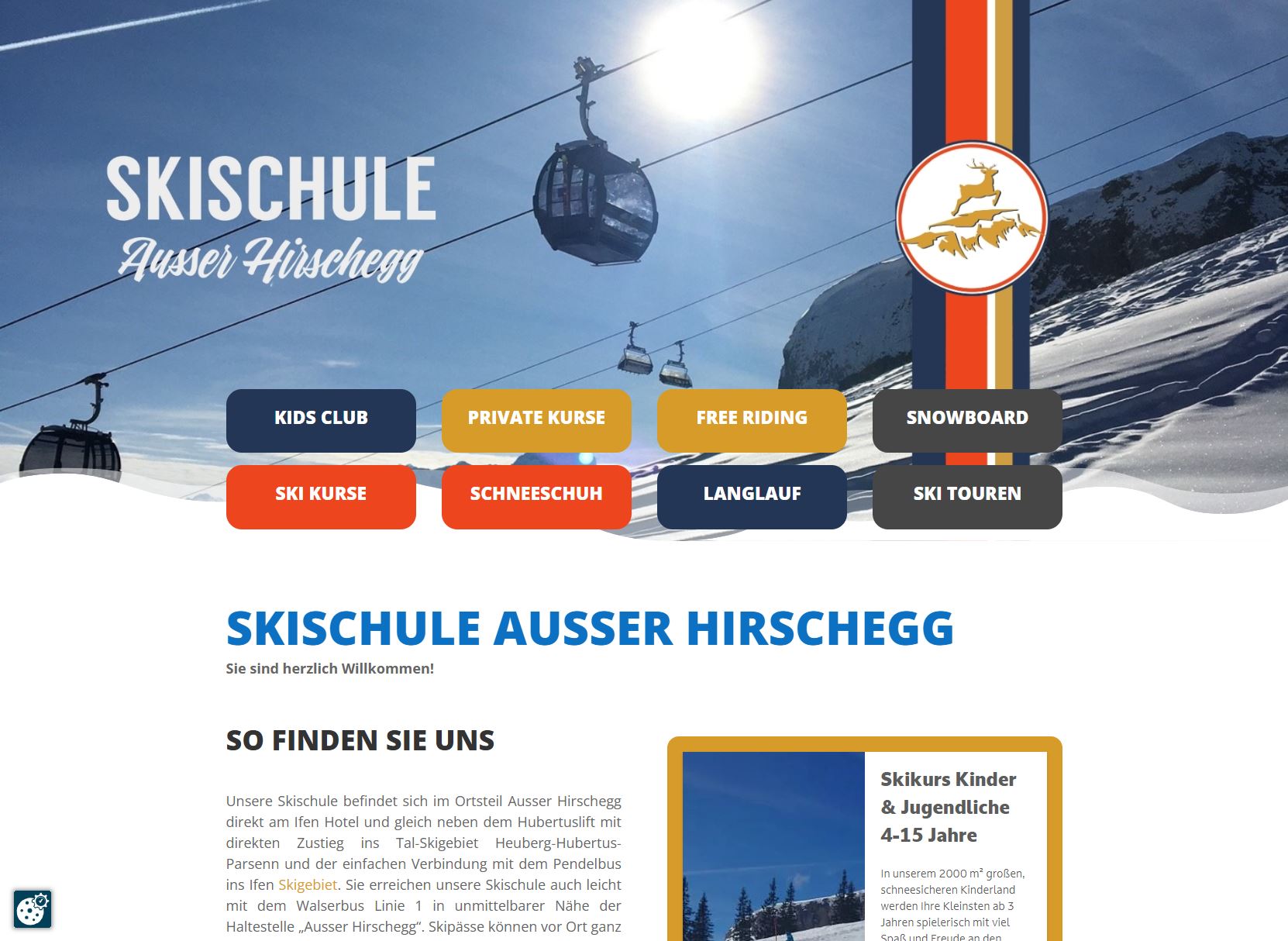 https://skischule-ausser-hirschegg.com/Für die Skischule Ausser Hirschegg unter neuer Führung, wurde eine neue Webseite erstellt. Diese enthält neben den einzelnen Skischulen die über einen Shop buchbar sind auch wichtige Informationen zur Einteilung von Skikursen, den Techniken, die die Skikursteilnehmer lernen und umfangreiche Informationen über das dazugehörige Kinderparadis und die direkt angrenzenden Liftanlagen. Die Skischule Ausser Hirschegg besticht ganz klar durch Ihre Lage und Ihre Ausbilder.